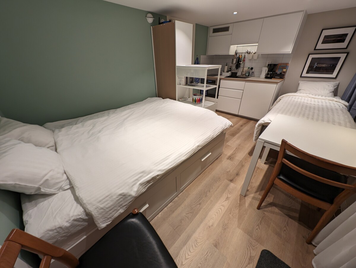 Apartamento recién renovado y fresco en todo momento, de alto nivel, en una zona tranquila y agradable. El apartamento tiene dos dormitorios separados con 2 camas de 90 cm que se pueden separar. Cada dormitorio y la sala de estar tienen su propio televisor con una amplia gama de canales y servicio de transmisión de películas. La cocina está equipada con nevera, microondas, placa de inducción, horno, lavavajillas y cafetera. Lavadora/secadora combinada en el baño. Aparcamiento gratuito con posibilidad de comprar la carga de un coche eléctrico. Cerca de varias paradas de autobús.