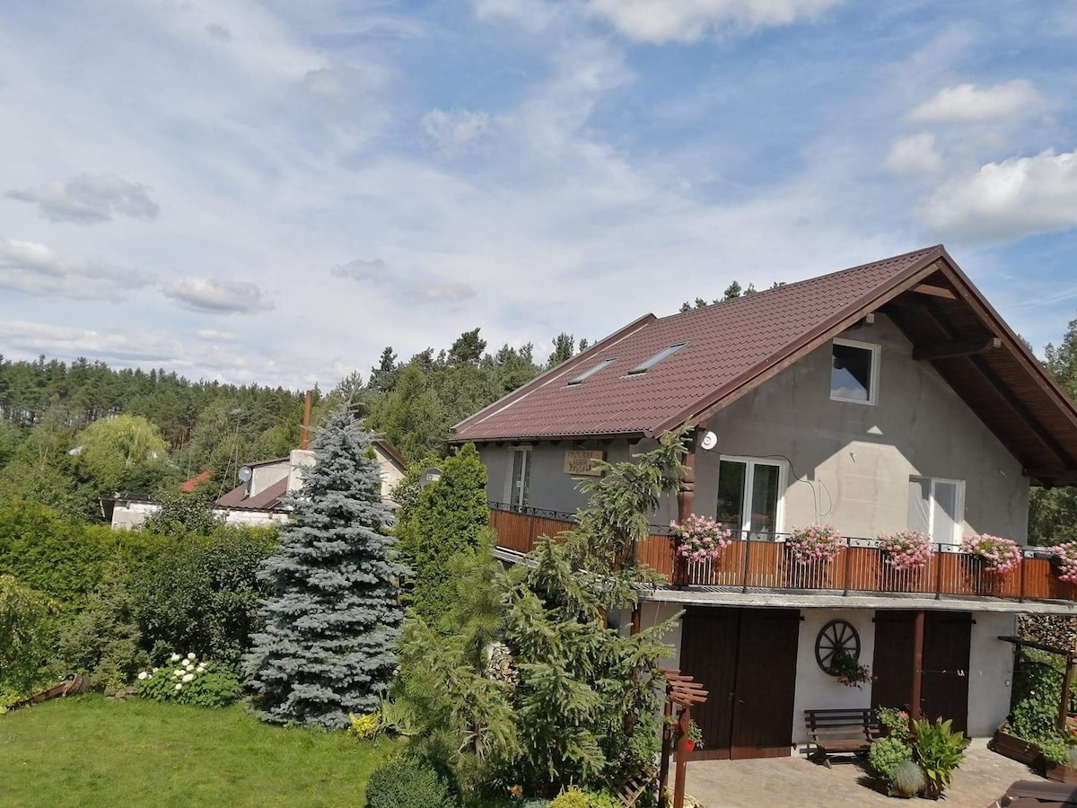 Alquilaré una casa en Kashubia. Una casa grande para huéspedes en una gran zona vallada (9200 m2). Cerca de 2 minicasas para mi uso privado. Toda la planta baja de la casa tiene dos dormitorios, un inodoro, una gran cocina totalmente equipada y una gran sala de estar. Habitación en la planta superior, con área para dormir para un máximo de cuatro personas. Dos dormitorios en la planta baja con camas dobles más una litera en un dormitorio más grande. La ciudad de Kościerzyna está a 5 km.
