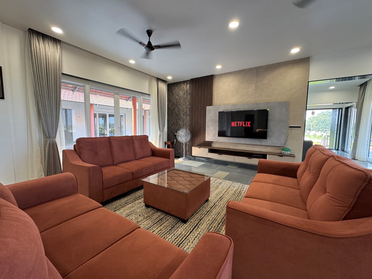 Bienvenido a The Airport Villa, una exclusiva casa de lujo de 2 dormitorios con aire acondicionado completo, ubicada en Shamshabad, cerca de NH-44. Perfecto para familias, estancias corporativas, eventos privados y rodajes de películas. No se permiten reservaciones para parejas no casadas o grupos mixtos. Los huéspedes pueden disfrutar de wifi rápido, espacios tranquilos al aire libre con teca y elegantes interiores. Un pastor alemán de 5 años también vive en la propiedad en una casa separada.