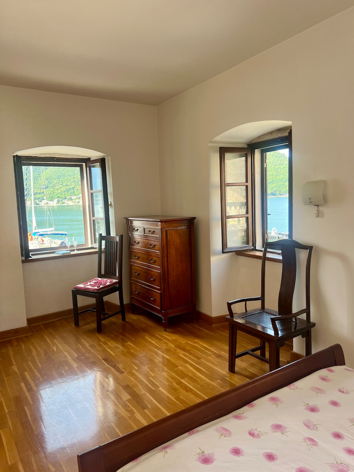 Bienvenido a un encantador apartamento situado en el corazón de Kotor. Sube las escaleras desde la calle para descubrir tu oasis privado, a un tiro de piedra de la vibrante energía de la ciudad. Al entrar, déjate cautivar por la presencia regia de una hermosa cama tamaño king antigua, adornada con intrincadas tallas y ropa de cama de lujo, que te invita a relajarte con elegancia. Vistas panorámicas de las encantadoras azoteas del casco antiguo de Kotor y las aguas de la bahía de Boka, infundiendo el espacio con luz natural y hermosos paisajes.