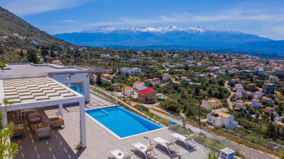 Brand new villa with a stunning view! A perfect spot for relaxation, a natural and peaceful environment, perfect for holidays in Crete island. The villa has been designed by aiming to create a luxurious atmosphere, in a full equipped villa. 3 bedrooms with double beds all of them with spectacular sea view. Enjoy panoramic scenery ranging from the blue strip of Souda Bay, the scattered Apokoronas villages to the magnificent 'White Mountains'.