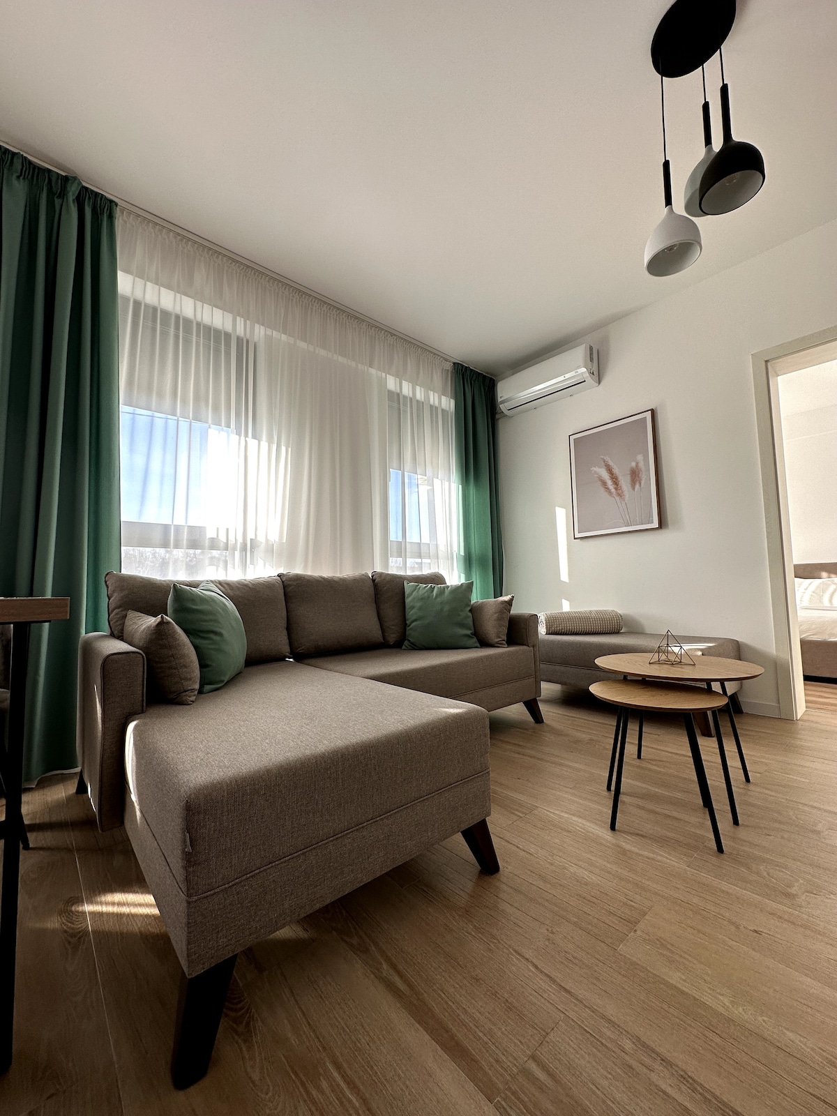 Apartament nou, luminos, cu design modern și parcare gratuită. Se poziționează la intrarea în Timișoara, în vecinătatea benzinăriei Esso. Apartamentul este dotat cu: -bucătărie complet utilată cu cele necesare: plită electrică, cuptor, mașină de spălat vase, frigider, aparat de cafea și veselă. -sufragerie open space în care oaspeții se pot bucura de un film, pe o canapea confortabilă, la un televizor Smart -dormitor cu pat matrimonial -baie cu cabină de duș și mașină de spălat rufe cu uscător.