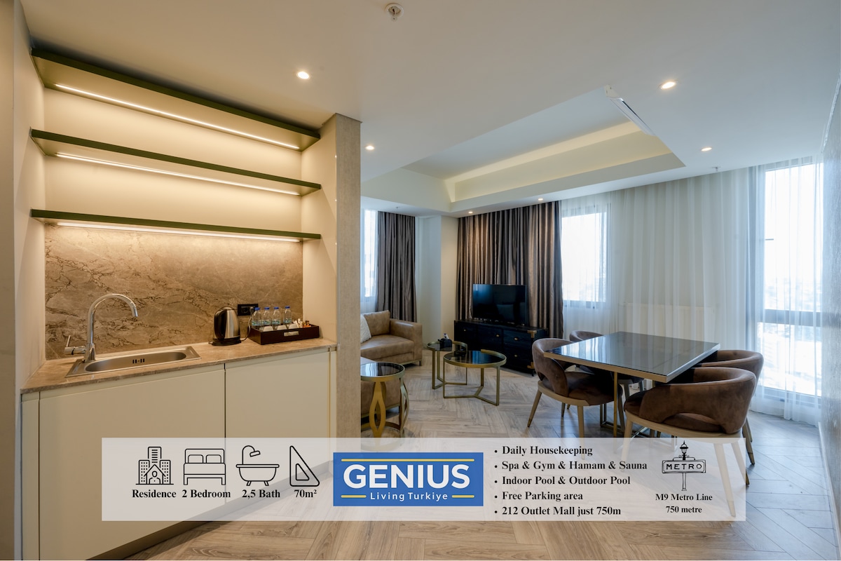 Welcome to this modern 2-bedroom apartment at, located in the vibrant Güneşli / Basin Ekspres area. 🌿This stylish apartment offers spacious living with a fully equipped kitchen, access to wellness facilities including an indoor pool, spa, sauna, and fitness center, and comes with daily free housekeeping service. 15Temmuz Metro Station on the M9 line is just 400 meters from the apartment. We wish you a pleasant stay! ✨