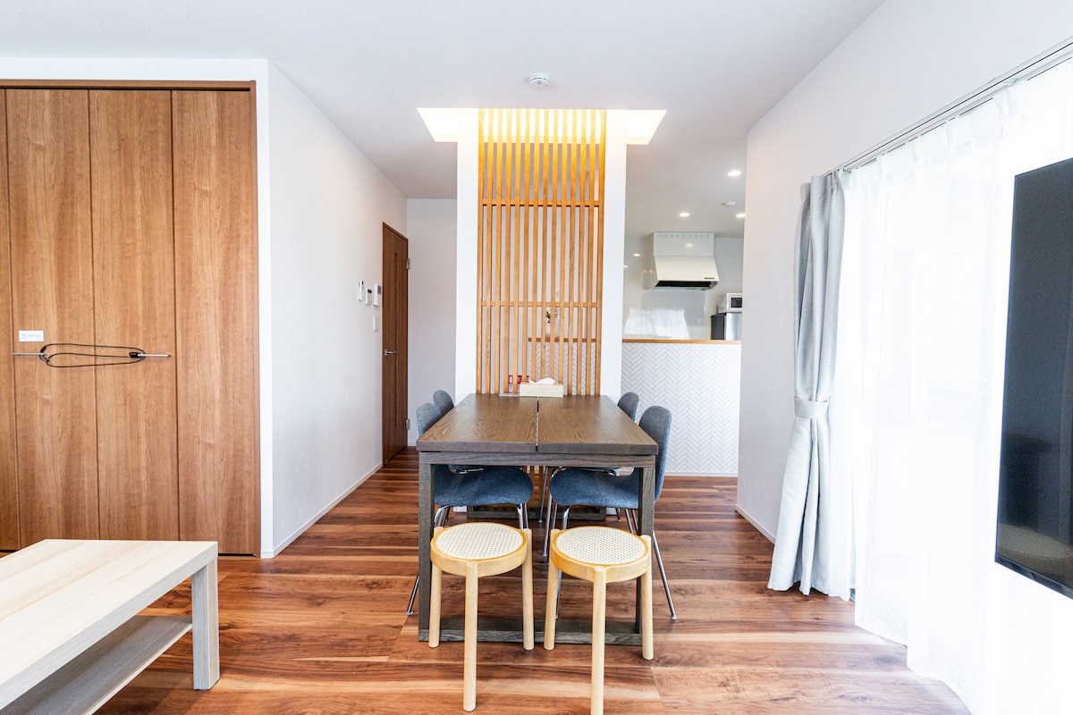 Es un hotel privado que puede usar lujosamente 80 ! un piso con estacionamiento gratuito a aproximadamente 1 km de la nueva ciudad del centro. La cocina está totalmente equipada con servicios básicos como nevera, microondas y utensilios de cocina.También hay tiendas de ramen populares, izakayas, cafeterías y supermercados cerca, por lo que es conveniente para visitas turísticas y estancias largas. ¡Genial para familias o viajes en grupo! Diseñado con el tema de un lugar para disfrutar de la conversación con tu familia y tus amigos, con mucho espacio para vivir.Un gran mostrador de comedor y un baño con bañera te ayudarán a descansar de tus viajes. Características de la habitación Espacio espacioso de ☆80 metros cuadrados☆ Sala de estar, comedor y cocina de más de ☆20 m ²☆ ☆Litera (2 camas dobles, 2 individuales)☆ Estancia larga y cómoda con ☆cocina, lavadora y secadora☆ [Puntos recomendados] Ideal para padres e hijos: tranquilidad, padres relajados Conveniente para hacer turismo: Castillo de Kumamoto a 17 minutos a pie, centro de la ciudad a 15 minutos a pie Zona histórica de Shinmachi: cafés retro y sabores locales