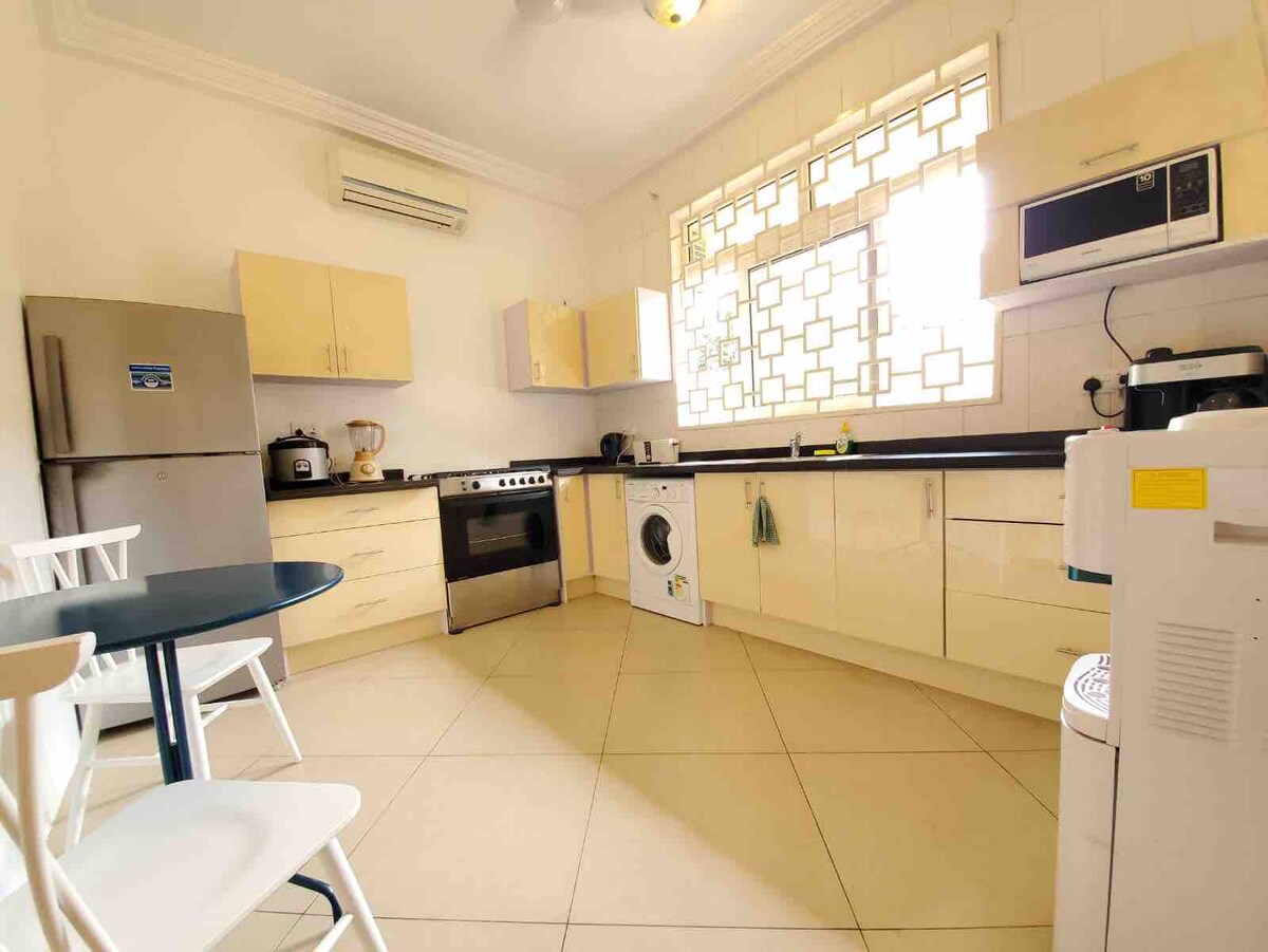 Un bungaló de un dormitorio cerrado por sí mismo. Date un baño. Haz ejercicio en el gimnasio. Relájate junto a la piscina o en el jardín. Cocina en tu propia cocina privada. Para su comodidad, tenemos un generador en espera, un pozo en el lugar más los tanques de agua. Por tu seguridad, tenemos seguridad itinerante las 24 horas, los 7 días de la semana, una valla eléctrica y una hermosa piscina y jardín. Cada piso tiene su propio router WIFI. Ofrecemos crédito WIFI de alta velocidad de 10 GB al momento del registro, crédito adicional disponible en Vodaphone al costo.