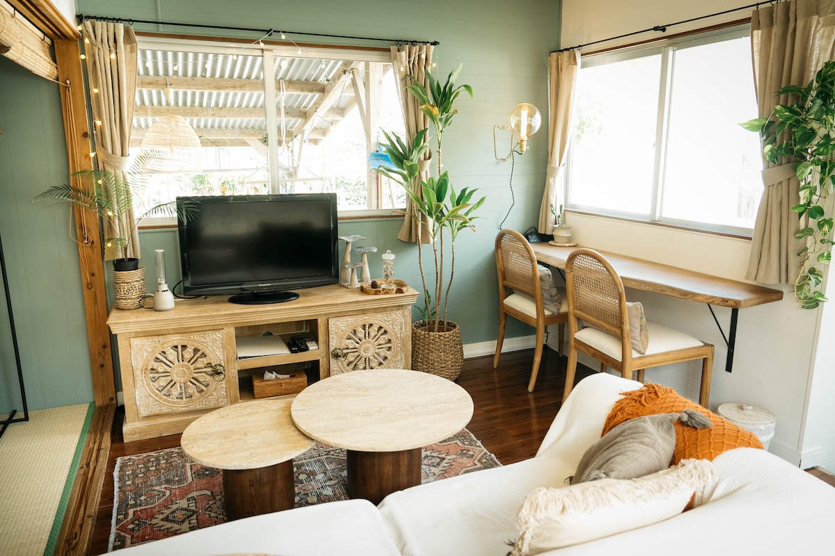ぷら家へようこそ。 ここは、私たち家族が日々の暮らしを営む母屋のすぐそばにある、小さな離れの宿です。 「ぷらっと来て、自宅のように過ごせる場所」をコンセプトに、沖縄の日常を感じられる空間をつくりました。 周囲には緑が多く、風の音や虫の声、時間とともに変わる光が静かに流れています。 近くにはビーチや文化遺産、ファーマーズマーケットがあり、話題のJUNGLIAや美ら海水族館へのアクセスも良好です。「暮らすように旅する沖縄」をぜひお楽しみください。