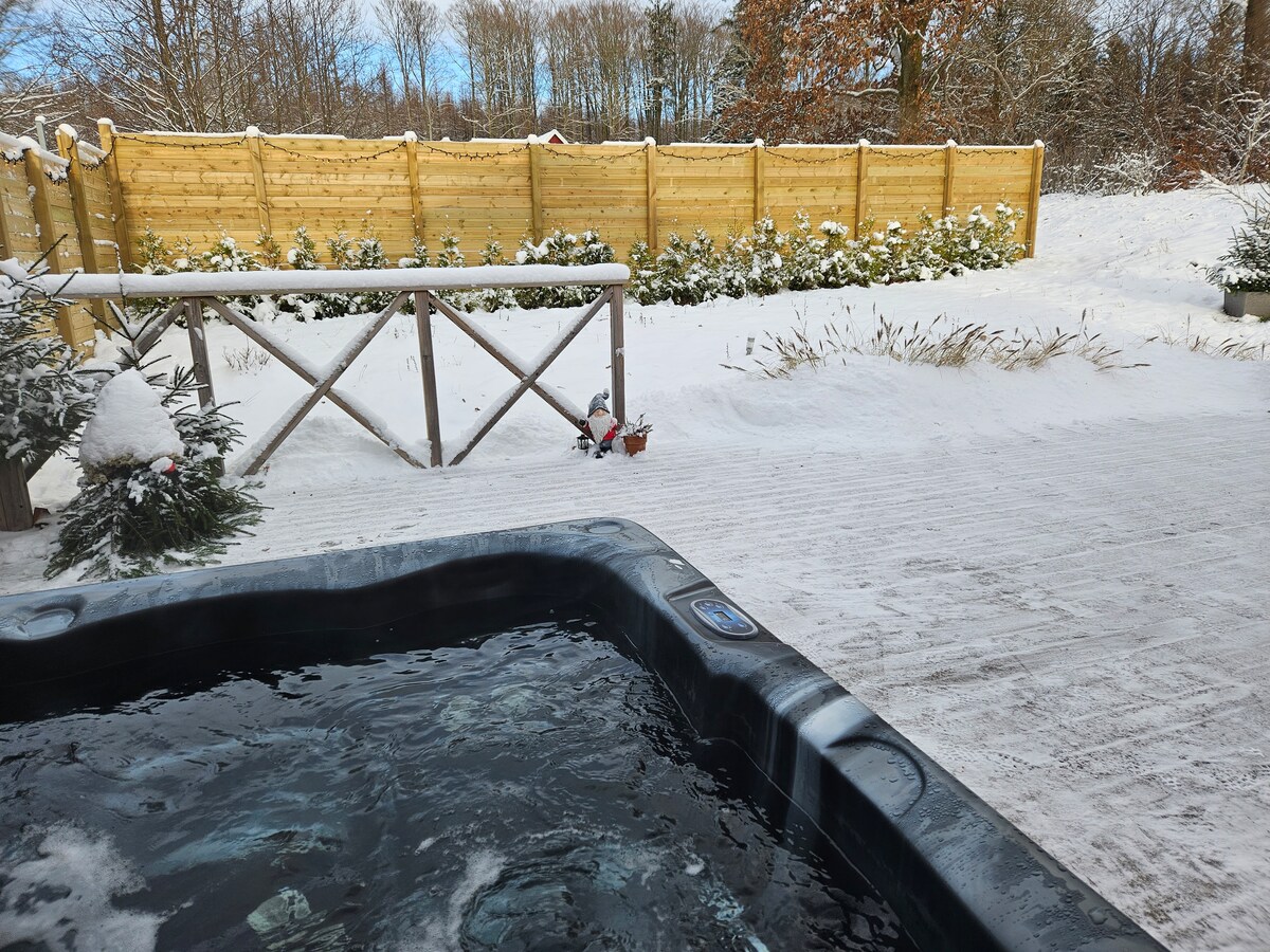 Bienvenido a una cabaña de madera ubicada en una ladera junto a la Reserva Natural de Fulltofta. Tienes acceso a toda la parcela que tiene una gran terraza de madera con jacuzzi integrado y vistas al valle. La cabaña tiene un loft para dormir, un dormitorio, un baño moderno y una acogedora sala de estar con una chimenea para las noches frente al fuego. Estación de carga de coches eléctricos en el estacionamiento✅ Recomendado para parejas/familias. No se permiten fiestas y es importante no mantener un volumen alto al aire libre por las noches después de las 9:00 p. m.