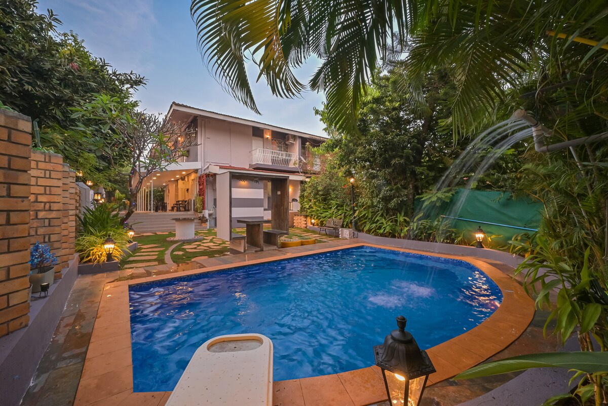 La villa 3BHk con licencia MTDC recientemente renovada tiene su propia piscina privada con ducha de lluvia, jardín ajardinado de 2000 pies cuadrados, además del porche delantero de 500 pies cuadrados y un comedor al aire libre junto a la piscina. El espacio al aire libre es amplio para disfrutar de la barbacoa y la cena mientras te sumerges en la piscina. La cocina está equipada con electrodomésticos y vajilla que te permiten cocinar tu propia comida u organizar una a través de nuestros cocineros de guardia. Se configuraron 3 dormitorios, 5 baños , pasillo y comedor con TV y sistemas de música.