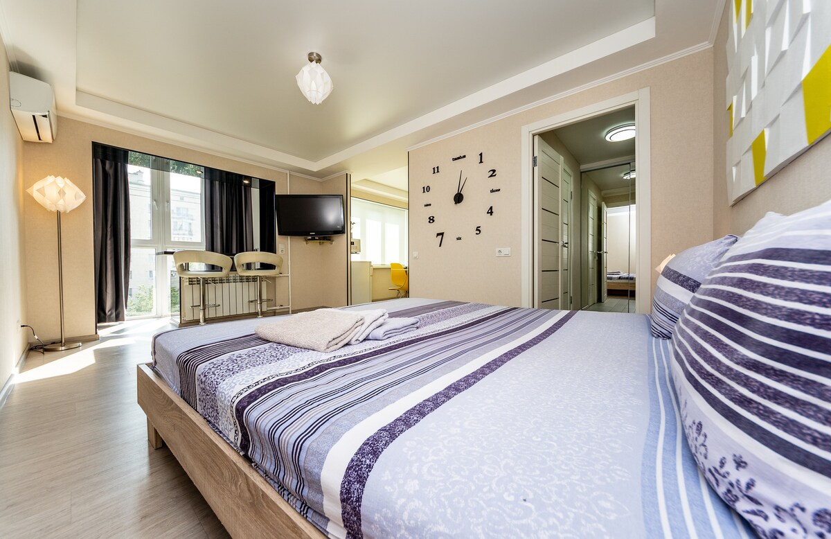Apartamento de lujo de 2 habitaciones, ubicado en el piso 11 de un edificio de 14 pisos. Departamento tranquilo y acogedor en una casa nueva. Con una bonita vista de la ciudad. La casa está vigilada las 24 horas, los 7 días de la semana. Renovación de diseño. Se utilizaron materiales naturales de calidad: piedra, madera, telas. Los huéspedes pueden llamarme o enviarme un mensaje de texto si tienen alguna pregunta.