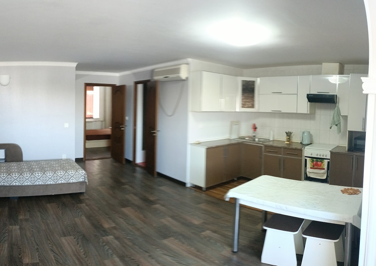 Quédate con tu familia en el centro de tu familia. Un complejo deportivo, una piscina, una pista de hielo cubierta, un super, alcohol, mercados de hamburguesas, un paseo marítimo para pasear cerca del río SYRDARIA están a poca distancia. Después de 3 paradas, el parque acuático y los clubes nocturnos. Escort de la ciudad (opcional)