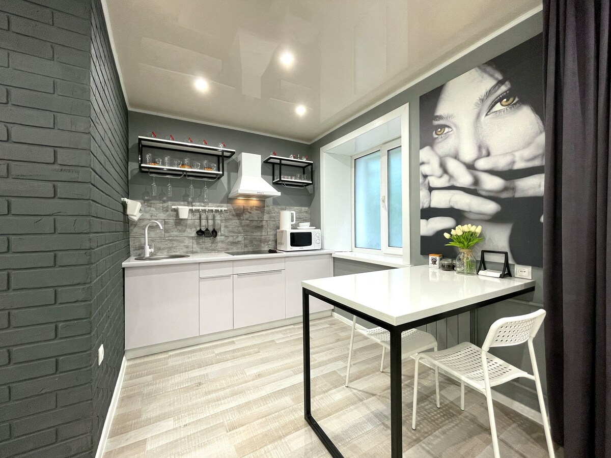 Un apartamento de lujo de 1 dormitorio en el centro de la ciudad. La ubicación es muy céntrica. Alojarse en el apartamento te dará emociones vívidas y querrás volver aquí otra vez. El apartamento está equipado con todos los electrodomésticos necesarios, una cama doble con colchón ortopédico (colchón con relleno de coco), un proyector, WIFI ilimitado, así como un sofá para una estancia cómoda.