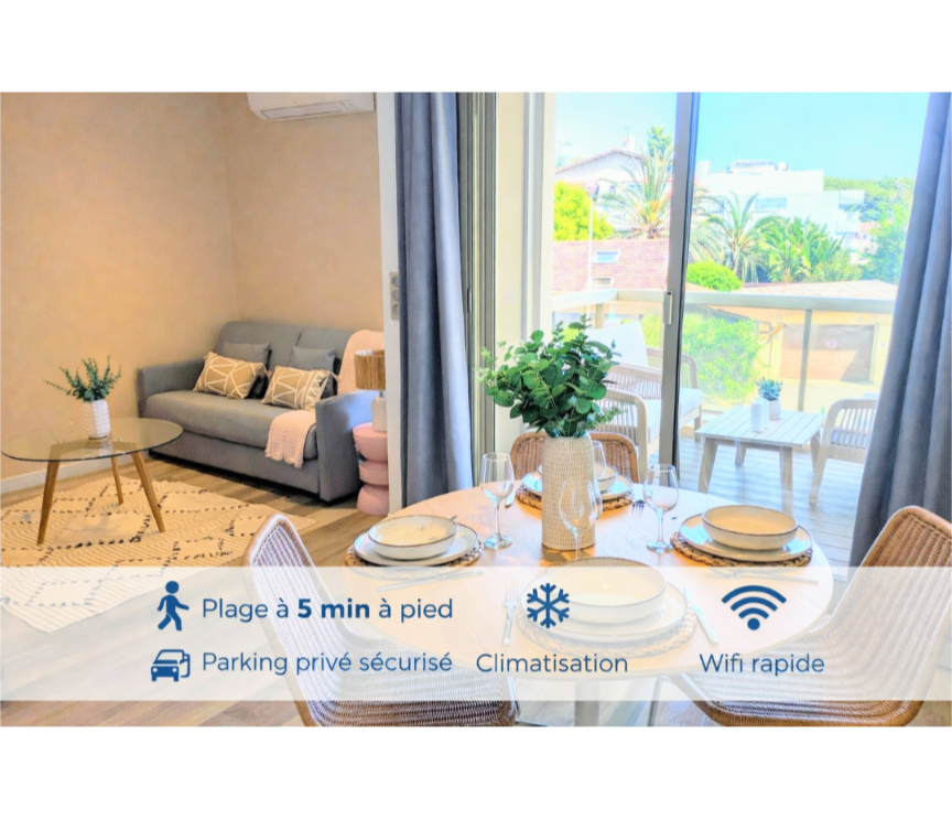 * PARKING INCLUS * * 3 MN A PIED DE LA PLAGE* PISCINE 🌴 À 200 m de la plage ! Appartement lumineux dans une résidence de standing avec piscine, parc et parking sécurisé. Idéal pour couples, familles ou pros. Tout à pied : restaurants, supermarché, salle de sport, laverie ... Découvrez Juan-les-Pins, entre Antibes, Cannes et Grasse, pour un séjour détente au cœur de la Côte d’Azur.