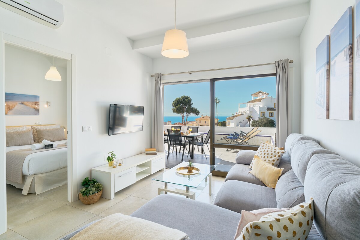 Un moderno apartamento de dos dormitorios con espectaculares vistas panorámicas del mar Mediterráneo en una urbanización aislada y tranquila con una hermosa piscina comunitaria. El apartamento cuenta con una luminosa sala de estar que se abre a una gran terraza con vistas panorámicas al mar y a las montañas. Las zonas comunes y los jardines bien cuidados con piscina comunitaria, lo que la convierte en la opción ideal para parejas, amigos o una familia. Esta propiedad también es ideal para el trabajo a distancia, ya que está equipada con internet de fibra.