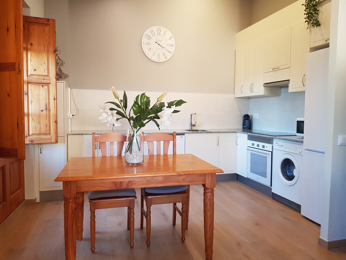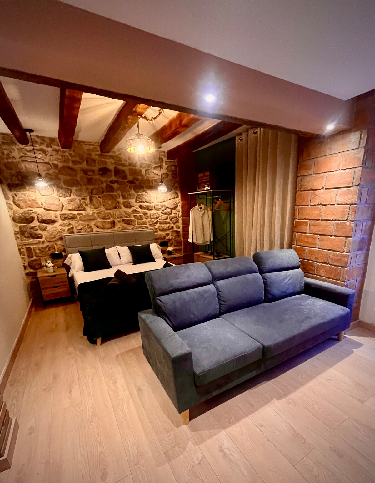 Apartamento con grandes balconeras, espacioso y de gran altura. Situado en la planta principal de una casa señorial de estructura gótica, con sus orígenes en el s. XIV. Conserva un arco de piedra de medio punto y los techos originales con bigas de madera. Con aire romántico con su cama dosel. Disfruta de las veladas en invierno al lado de la chimenea. Un espacio con carácter propio, en perfecta harmonía entre arquitectura medieval, diseño y confort. Totalmente equipado con cocina y baño
