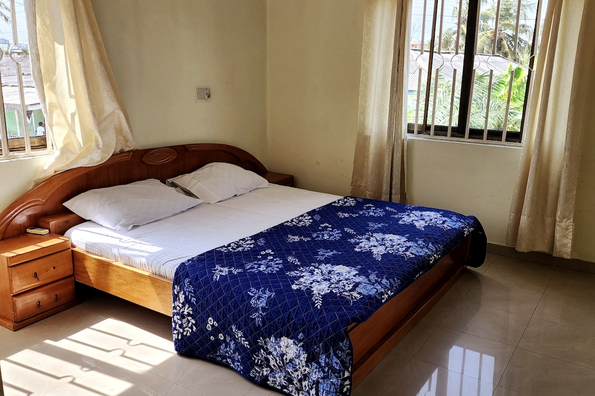 Un apartamento ESPACIOSO, sencillo y acogedor en el primer piso de dos camas situado en una popular zona residencial de Accra - Osu (Labadi). Estarás a dos minutos en coche de la playa y a pocos minutos a pie de la carretera principal. La propiedad cuenta con un pasillo de entrada, dormitorios TOTALMENTE AMUEBLADOS con un dormitorio principal en suite, cocina, salón, balcón y una ducha e inodoro para el segundo dormitorio. Hay conexión wifi con CONEXIÓN WIFI muy rápida. Se accede a través de una escalera de entrada lateral que te da total privacidad durante tu estadía.