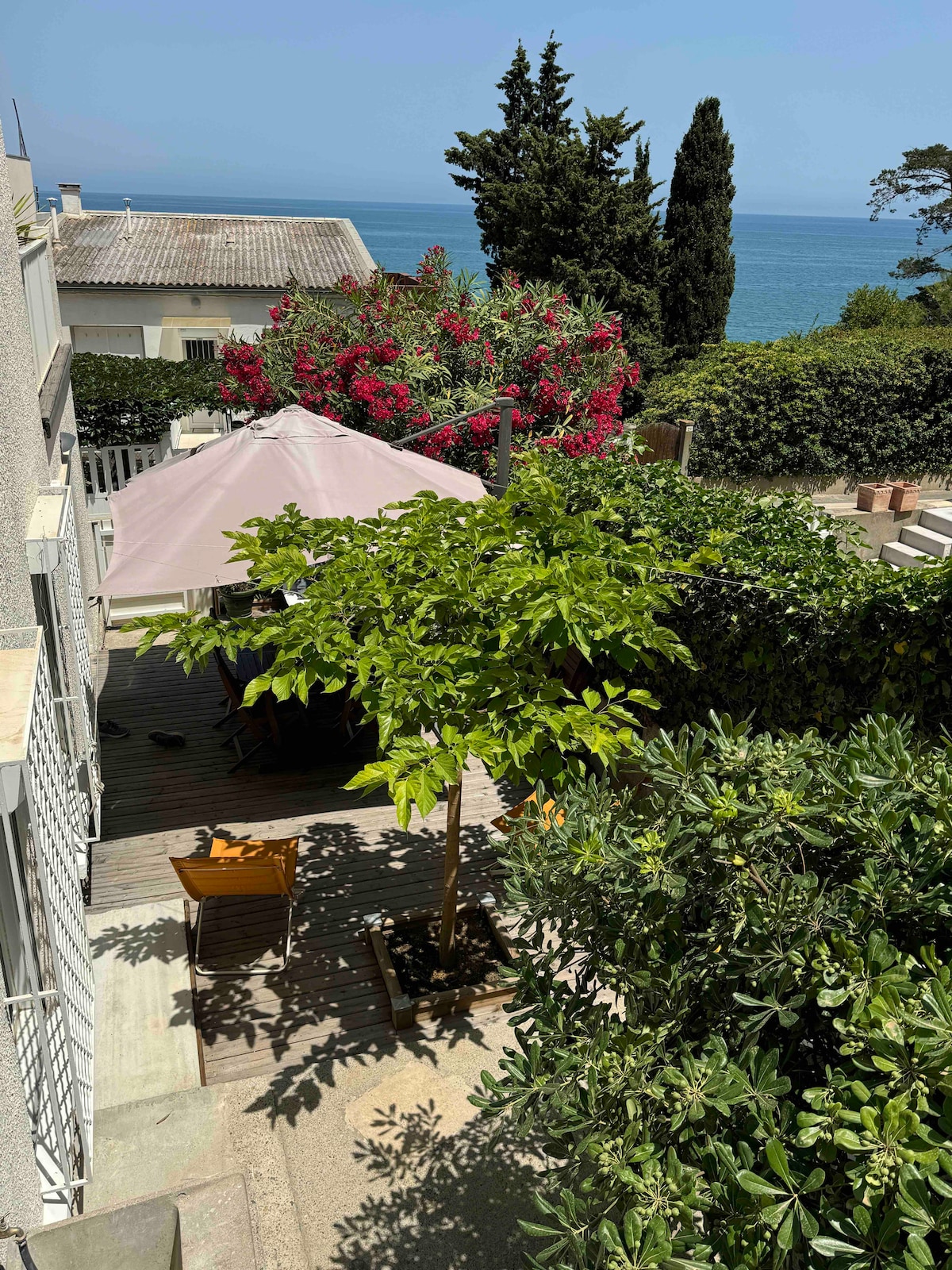 A 200 m andando de la playa, comercios, restaurantes y bares. Situado en una calle muy tranquila (segunda línea), con pequeñas vistas al mar y en lo alto a la ladera del acantilado. Su apartamento se encuentra en una casa en la planta baja, tiene aire acondicionado y/o ventilado. Tiene una terraza privada a la sombra de los pinos y ha sido totalmente renovado en 2024. Consta de 2 dormitorios, una sala de estar-cocina, un baño con ducha. El apartamento es bonito, cómodo y bien equipado. Fue clasificado * ** por las Gites de France.
