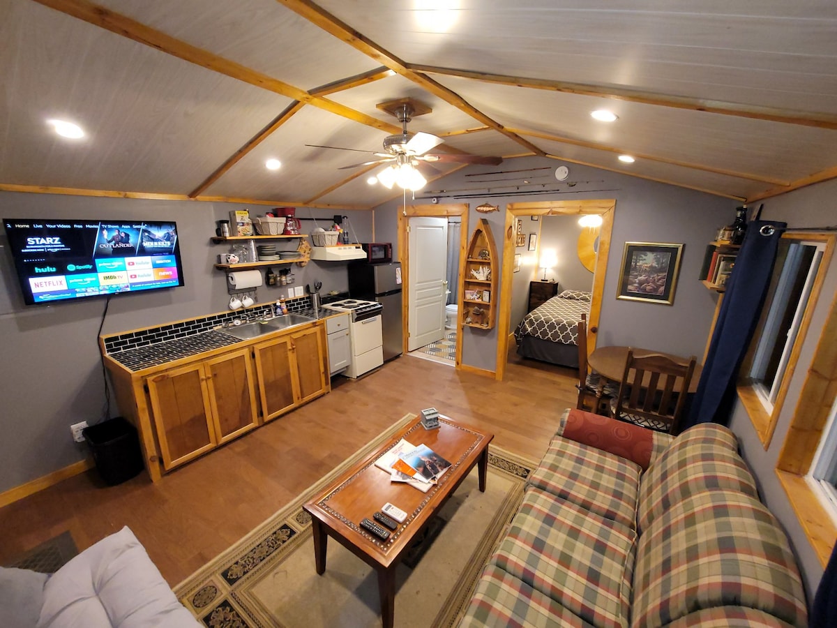 Escápate a nuestra encantadora minicasa con temática de avión, donde puedes acurrucarte y relajarte en un refugio único inspirado en una cabaña aérea. Este nuevo alojamiento está construido con paneles aislantes de acero, lo que garantiza comodidad y durabilidad. Ubicado en una tranquila propiedad de 1,6 acres, disfrutarás de los tranquilos alrededores con un granero rojo rústico, coral de caballo y un amplio espacio para que tus mascotas deambulen libremente. ¡Prepárate para una escapada relajante en este acogedor refugio!
