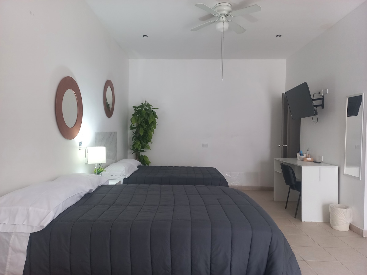 Alojamiento para grupos chicos y grandes en Torreón Coahuila. 💡Ideal para estancias cortas, económicas y privadas. ✈️ A 5 min del aeropuerto 🚌A 5 min de la central de autobuses 🏥 A 10 min del IMSS/71 ✅ A 20 min del centro de Torreón. 🚿Baño completo cada apto. ❄️ Aire frío ✅WIFI 📺TV ✅Mini refrigerador 🧺Lavadora ✅Mismo acceso, 5 departamentos independientes con entrada por escalera. 📍Ubicado sobre Av Bravo Oriente