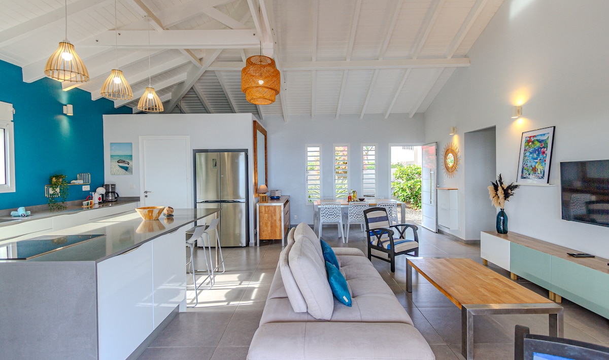 Casa , vistas 180° al mar Caribe. Playa a 50 metros. Cocina totalmente equipada (placa, microondas, lavavajillas, lavadora, etc.), aire acondicionado en las habitaciones, gran terraza de 50 m2. Bar abierto en el porche. Cubierta con solárium y barbacoa. Amplias habitaciones con armarios empotrados. 2 baños, 2 aseos. Salón y comedor en el porche. Wifi gratuito (fibra) Cerca de una carretera transitada que provoca ruido de coches durante el día. Este inconveniente desaparece por la tarde y la noche.