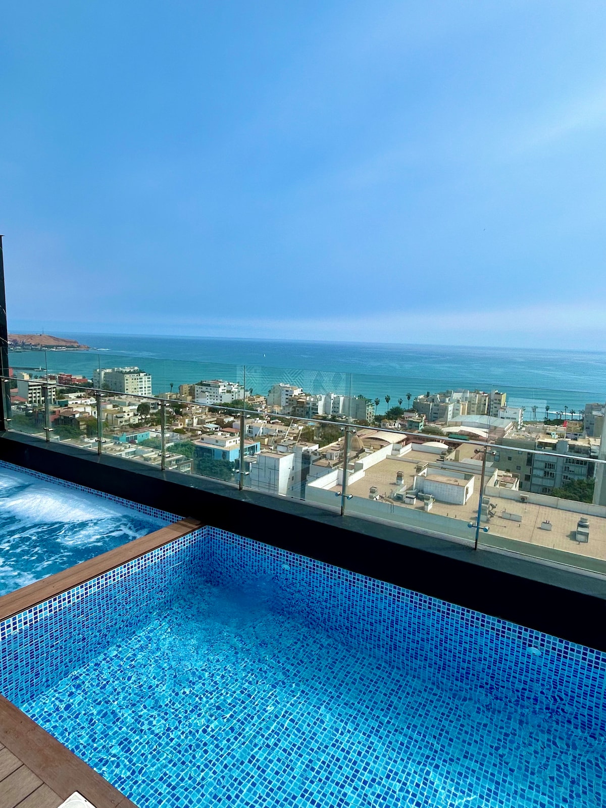 Disfruta de este increíble apartamento con vista al mar desde todos sus ambientes. Relájate en un balcón súper fresco con vista a la ciudad o en la piscina del piso 21. Ubicación inmejorable: a 5 min del malecón y 15 min de la playa caminando. Nota: Para garantizar una estancia segura y cumplir normativas locales, solicitamos copia o número de documento de identidad antes de la llegada.