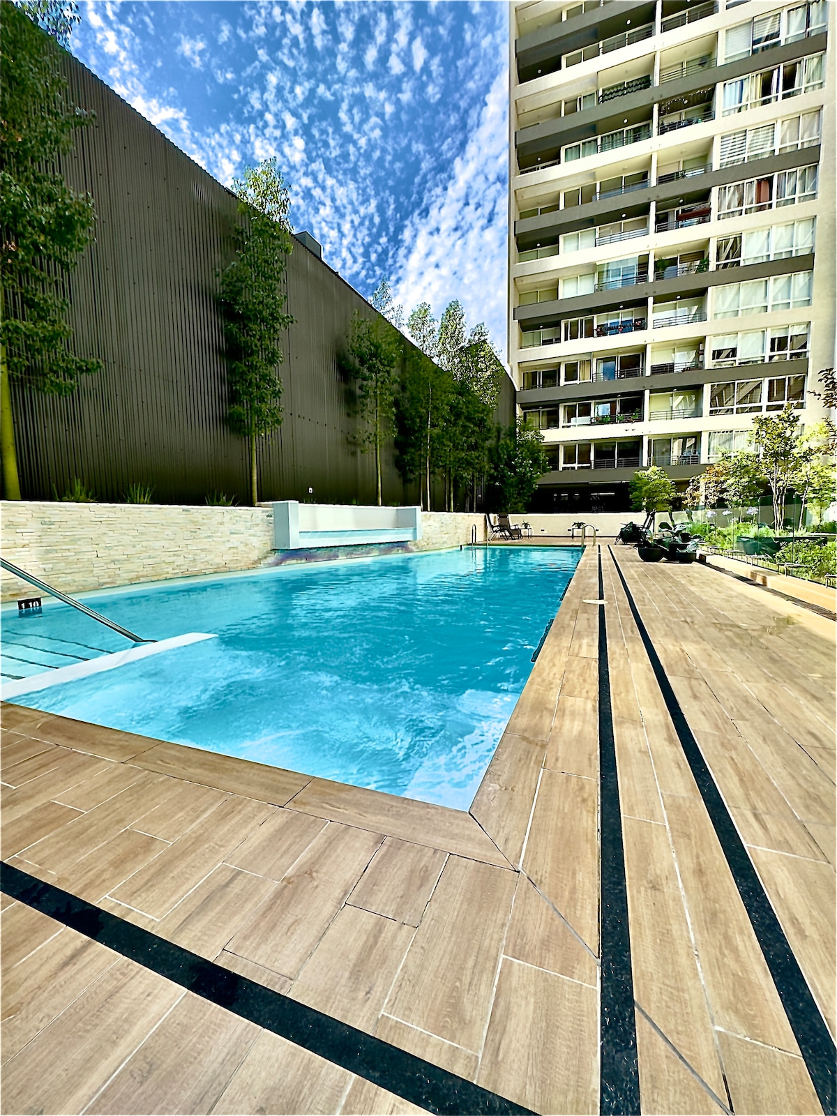 Moderno departamento con espectacular vista a la cordillera, a pasos del Mall Parque Arauco. Piscina temperada, gimnasio, seguridad 24h y estacionamiento. Dos habitaciones, cama king + 2 camas individuales, sofá cama de dos plazas en la sala, 2 baños, terraza cerrada con protección en ventanas, ideal para familias. Lavadora/secadora, lavavajillas, Wi-Fi alta velocidad y escritorio de trabajo. Totalmente equipado para estadías cómodas, seguras y funcionales.