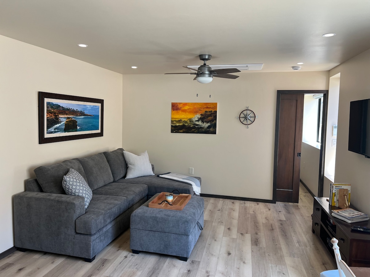 Escápate a este luminoso y encantador apartamento costero, a pocos minutos de la playa. Perfecto para parejas o viajeros solitarios, este espacio cuidadosamente diseñado cuenta con una lujosa cama tamaño king, un acogedor rincón comedor, una relajante sala de estar con sofá cama y un baño fresco y acogedor. Disfruta de mañanas tranquilas, comodidad elegante y una ubicación fácil cerca de todo lo que ofrece Point Loma.