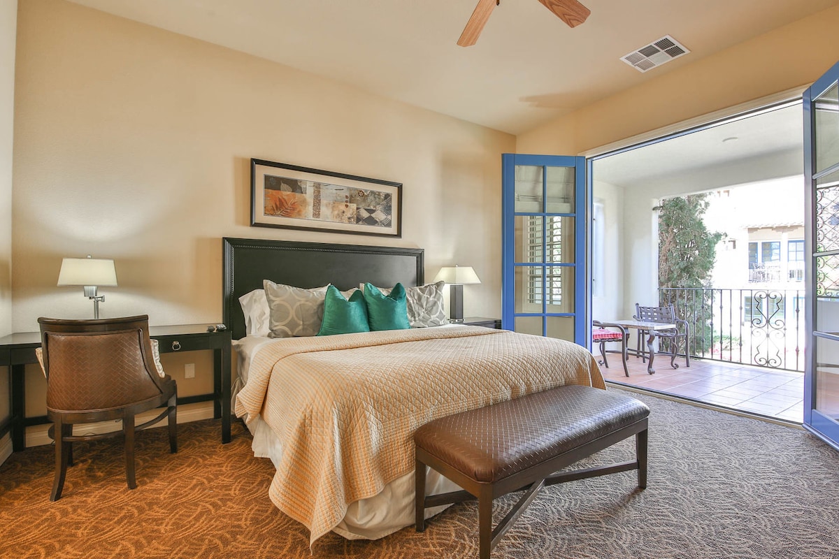 Nuestra suite estudio con cama tamaño king Legacy Palms es un espacio recién reformado, espacioso y luminoso con un ambiente moderno del desierto de California. Las puertas francesas se abren a un balcón privado con vistas a los exuberantes jardines de la villa y a las fuentes de agua. La suite cuenta con TV inteligente con cable premium, mininevera, microondas y cafetera Keurig, además de un baño privado con bañera de inmersión y ducha separada. Los terrenos de la comunidad cuentan con 12 piscinas climatizadas y spas, un gimnasio, hamacas, parrillas y mucho más.