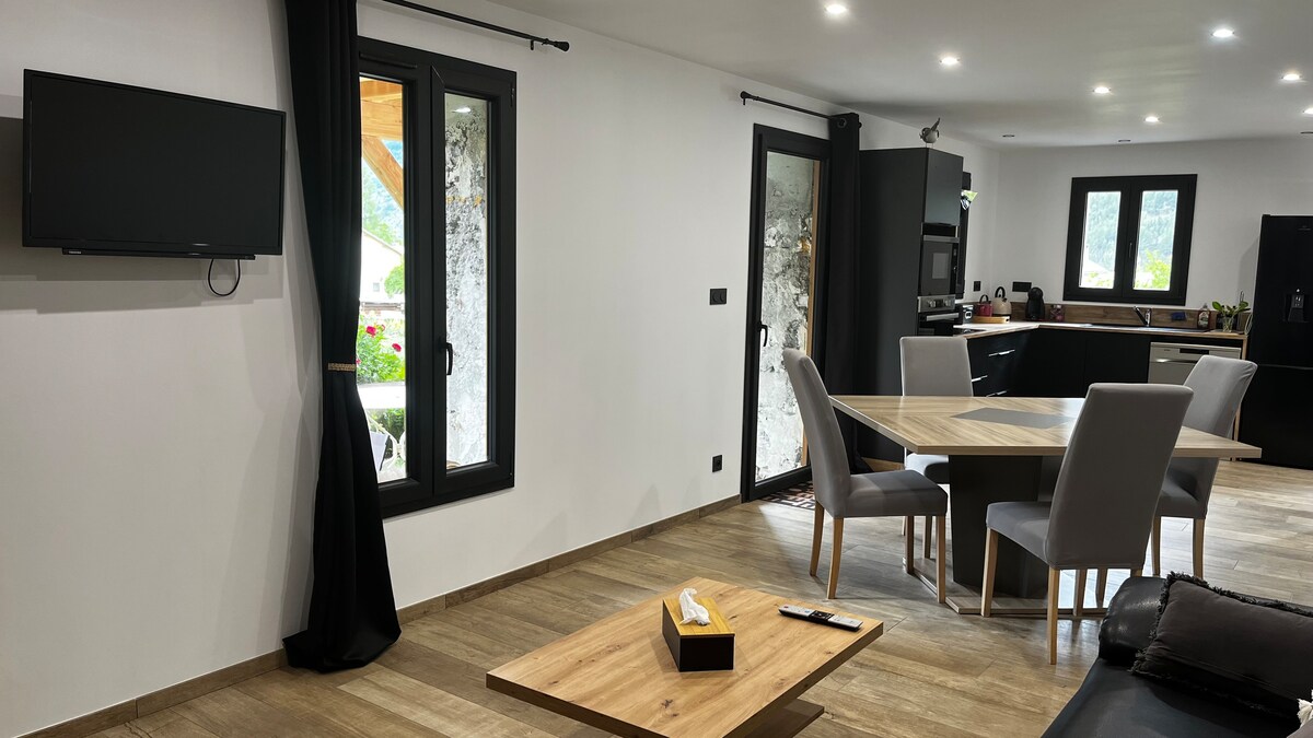 El chalet ofrece vistas panorámicas a las cumbres desde todos los lados. Además de la sala de estar, cuyos ventanales dan la impresión de vivir en el paisaje, la planta superior ofrece 3 dormitorios (2 cerrados) y un baño, todos con grandes aberturas para multiplicar los puntos de vista. El diseño interior, una mezcla de autenticidad y modernidad, adopta el estilo chalet como hilo conductor, en armonía con la madera dominante, dejada al natural. La elección de los colores y materiales asegura un ambiente acogedor.
