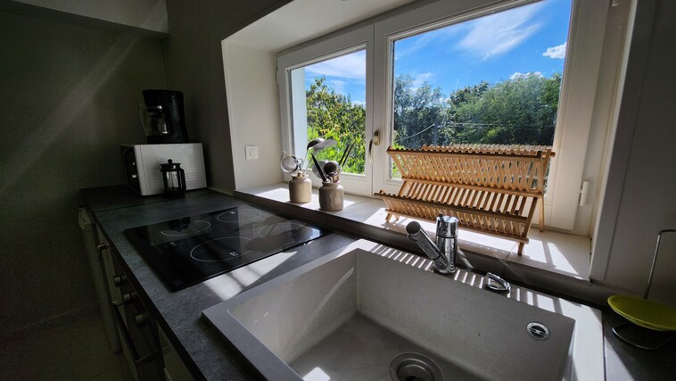 Olvídate de tus preocupaciones en este alojamiento espacioso y sereno. Es un apartamento independiente en la planta baja del jardín de nuestra casa. Consta de una sala de estar con sofá cama, una cocina independiente, un dormitorio con armarios empotrados, un baño con inodoro separado. El salón y la cocina dan a una terraza sombreada. Se puede estacionar un automóvil en la entrada al lado del apartamento. Este alojamiento está bien comunicado por autobús con Saint Étienne y Saint Chamond.