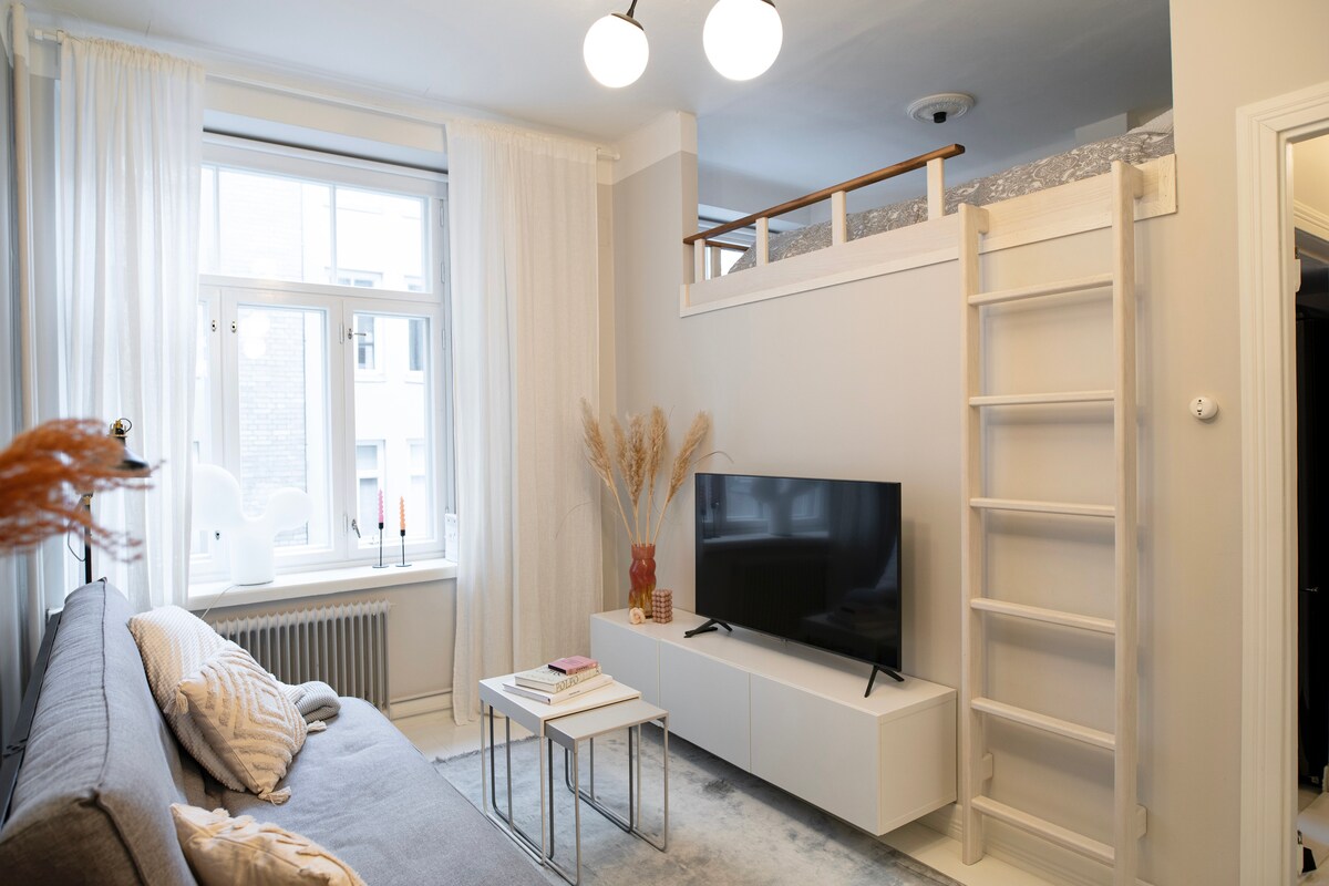 Ático único con sauna y terraza en la azotea en Punavuori. Este ático recientemente renovado ofrece una combinación perfecta de comodidad moderna y vida urbana vibrante. A pesar de su tamaño compacto, el departamento está totalmente equipado con todos los servicios esenciales: lavadora, lavavajillas, horno/microondas, barbacoa y hervidor de agua para garantizar una estancia sin problemas. Situado en el corazón de Punavuori, estarás a pocos pasos de todos los servicios del centro, cafeterías de moda, restaurantes y excelentes conexiones de transporte.