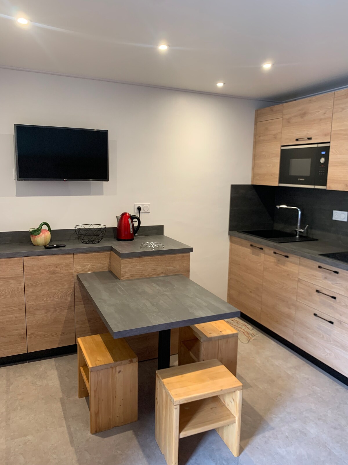 El departamento de 28 m2 está completamente renovado. Tiene una habitación doble (140/200) con espacio de almacenamiento. La sala de estar tiene un cómodo sofá (que se puede convertir en una cama individual para dormir), un televisor, un WIFI de Internet. La cocina está equipada con un microondas, lavavajillas, nevera, cerámica vítrea y placa eléctrica. La ropa de cama y las toallas están incluidas para el invierno (para estancias de más de 3 noches y 10 € por persona para estancias de verano y pantalones cortos). No se aceptan bicicletas en el departamento.