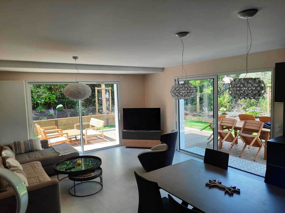 Centro de Hossegor, lujoso T3 con ascensor, planta baja. Perfecta ubicación entre el lago (100 m), el mar (2 km) y el campo de golf (1 km). Sala de estar abierta a la terraza y al jardín. Cocina abierta a la sala de estar, amplia y totalmente equipada. 2 hermosas habitaciones luminosas, abiertas al jardín , camas de 160 cm con ropa de cama de espuma viscoelástica. Cuarto de baño, ducha italiana. Terraza, con muebles de jardín, barbacoa, 2 aparcamientos privados gratuitos en el sótano. Nota: alquiler de sábado a sábado en junio, julio, agosto