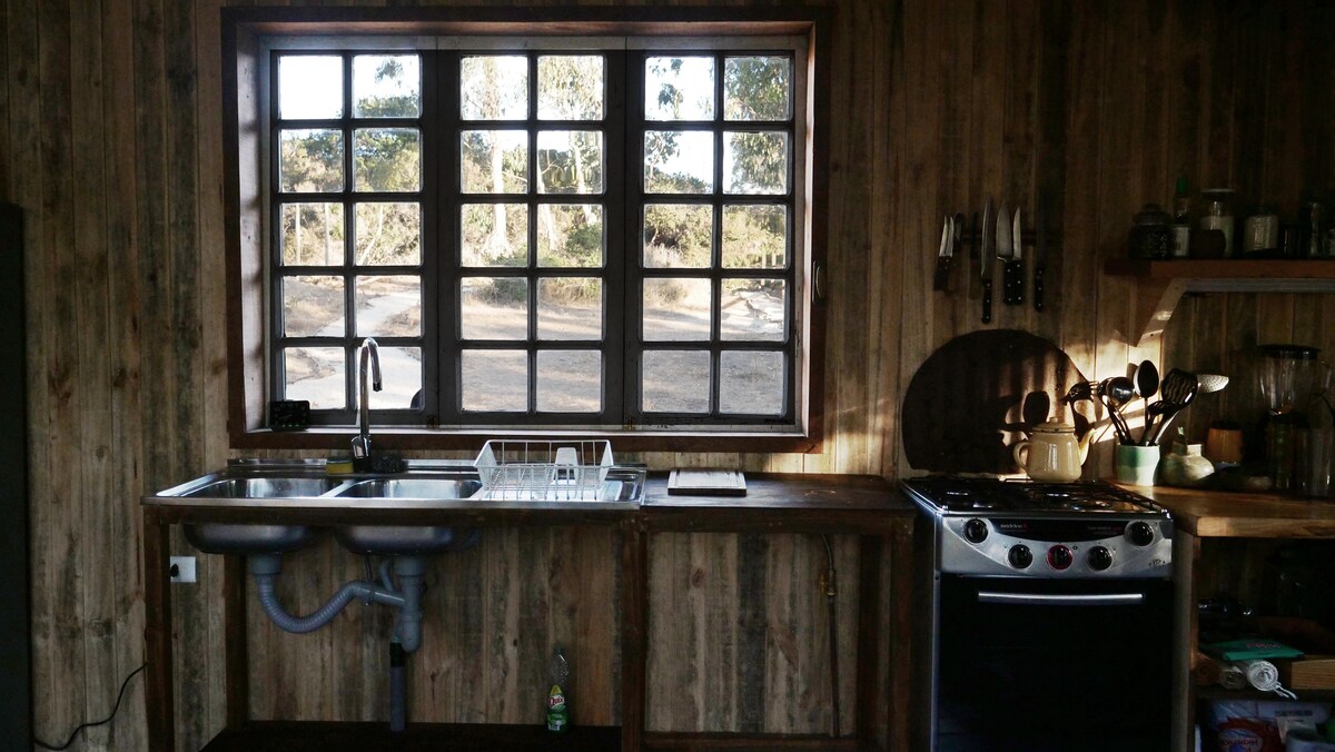 Cabaña de madera con tinaja y starlink en medio de la naturaleza, con increíbles vistas a la laguna de cáhuil y a una quebrada de bosque nativo. Este mágico lugar está bien conectado con las principales atracciones de la zona, pero a la vez retirado lo justo y necesario para disfrutar del silencio del bosque. Tiene terrazas para tomar sol, hot tub, rampa de skate, fogón, parrilla a gas y a leña. Full señal celular y wifi. En invierno con lluvia se recomienda 4x4.