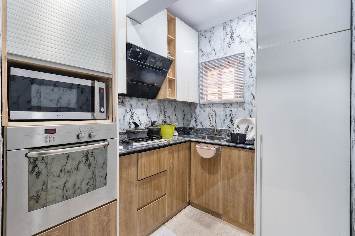 Te damos la bienvenida a Elmstead Luxury Aprt, tu elegante refugio en Lekki Ikota. Este refugio de 2 dormitorios y 2 baños ofrece comodidad de aire acondicionado, un televisor de 65 pulgadas en la sala de estar, televisor de 43 pulgadas en los dormitorios, WiFi ilimitado estable gratuito y energía las 24 horas, los 7 días de la semana con inversor y energía solar. Disfruta de la llegada autónoma con cerradura inteligente, estacionamiento gratuito, una lavadora en la vivienda y un castillo inflable para niños. 1 limpieza gratuita para estadías de más de 5-6 noches. Cerca del centro de conservación de Lekki, Mega Chicken, Blackbell y Blemco. Perfecto para viajeros solitarios, huéspedes de negocios, familias o estancias largas.