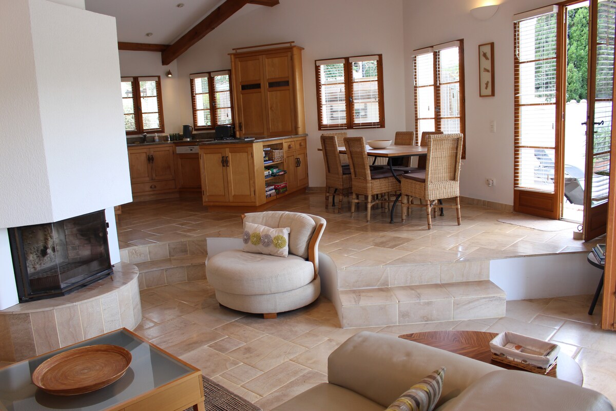 Una maravillosa villa de arquitecto único diseñada con fabulosa piscina y terrazas, además de impresionantes vistas panorámicas en todas las direcciones, enclavada en sus propios terrenos privados a solo 2 pasos del corazón del hermoso pueblo medieval histórico de Lagrasse. Nuestro preciado hogar te ofrece un alojamiento elegante y de calidad con la oportunidad de relajarte durante el día en sus terrazas con cenas al aire libre y nadando en la piscina o, con un corto paseo de dos minutos, puedes disfrutar del almuerzo en uno de los muchos restaurantes de Lagrasse.