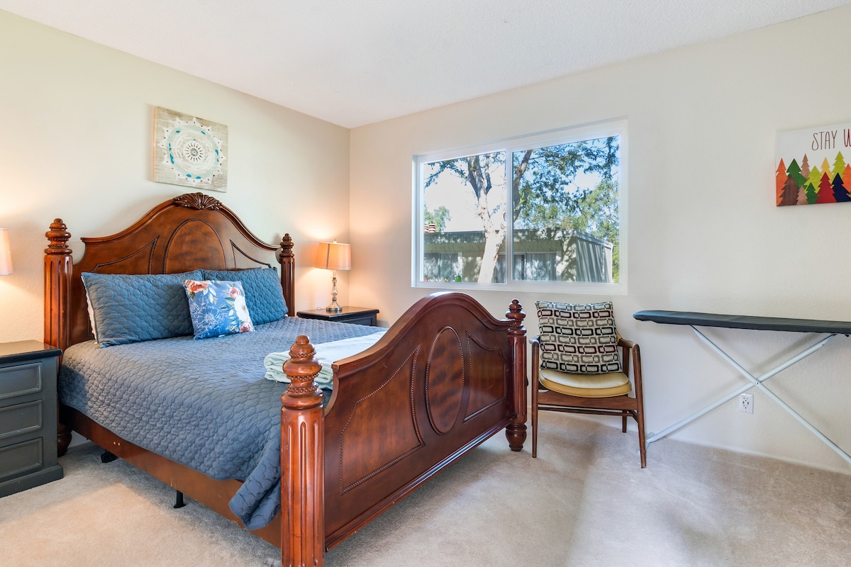 A solo 3 minutos de la autopista 5 se encuentra este estudio adjunto pero privado. Una vez que entres por tu entrada privada, te sentirás como en casa. Cómoda cama tamaño queen, chimenea y cocina americana totalmente equipada con mininevera/congelador si te apetece cocinar. También hay una mesa/escritorio para 2 personas frente a la cálida chimenea eléctrica. El ventilador de techo mantiene las cosas frescas. Baño completo con ducha y bañera. La playa de Salt Creek, el puerto de Dana Point y Trestles están a solo 15-20 minutos. ¡Excelente ubicación!
