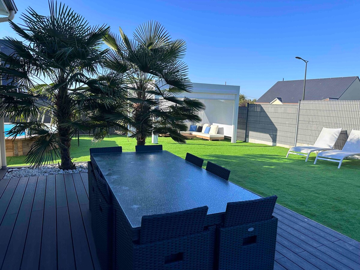 - Just 10 minutes from the racetrack and 5 minutes from the tram, enjoy this architect-designed house in a peaceful setting on the doorstep of Le Mans. - 3000m² garden, double garage and 2 private parking spaces. - Covered 5x10m swimming pool, petanque area. - 60m² terrace with bbq. The entire house is at your disposal, except for our bedroom and the study. You have access to all the traditional comforts: Wifi, TV, swimming pool, etc... A bathroom on the first floor with the 3 bedrooms.