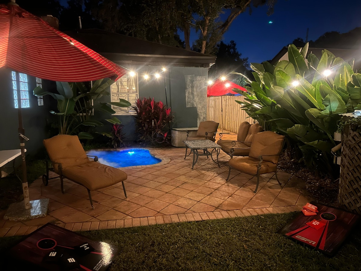 Nestled in one of the most coveted neighborhoods near Downtown Orlando (Ivanhoe Village), you'll be within a 5-min walk to tons of restaurants, bars, breweries, and boutique shops. Boasting a heated pool, hot tub, tiki bar, patio area w/seating & two living areas -you'll have ample room to play, entertain or relax in your Tropical Oasis! ☀ Harry P. Leu Gardens – 4 mins ☀ Orlando Museum of Art – 4 mins ☀ Universal Studios – 19 mins ☀ Walt Disney World – 24 mins ☀ The Mall at Millenia – 16 mins