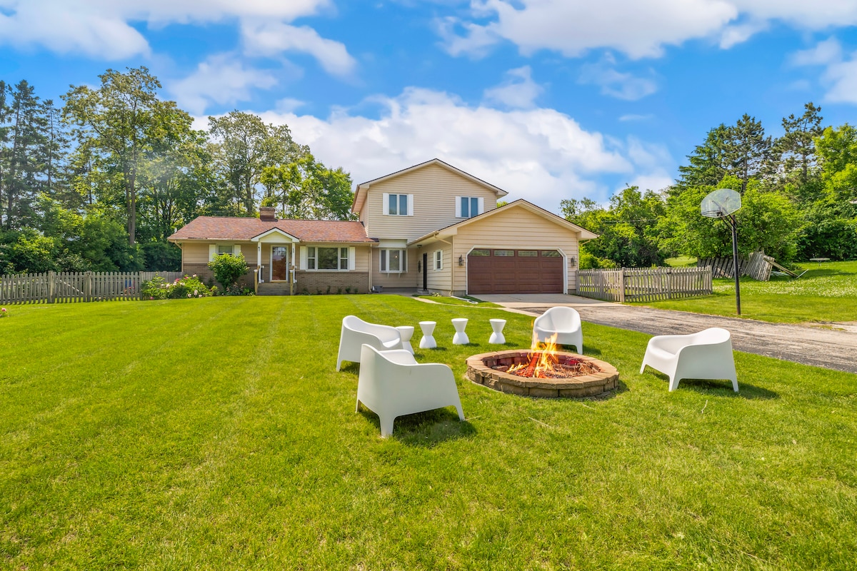 Relájate y encuentra tu inspiración a solo 1,5 horas de Chicago en el Ten Acre Farmhouse Retreat. Diseñado para familias, momentos íntimos y retiros. El wifi de alta velocidad, los televisores inteligentes y los espacios de trabajo mejoran tu estancia. Esta finca de 5000 pies cuadrados combina la comodidad moderna con el encanto rústico en 10 acres tranquilos cerca del lago de Ginebra. Te esperan lujosas habitaciones, un jacuzzi y entretenimiento de primera calidad. Dos cámaras exteriores monitorean el patio delantero y la entrada. No hay cámaras interiores. Reserva ahora.