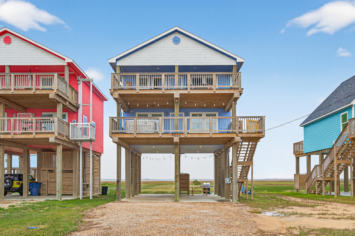NEW Beachfront Construction! Truly a Unicorn:🦄 LOCATION and LUXURY on SAND, and steps away from the best restaurant in Surfside (SEAHORSE)! Enjoy hammocks and games under the house. Charcoal grill. Climb the steps to an awesome shaded deck with views from San Luis Pass all the way to the Jetty! More than 180 degree unobstructed views! Bedrooms open to SunDeck and stargazing with fire 🔥 pit YouTube Beachfront Luxe for video. $125 clean fee and $75 for 2 pets will show in the total price quoted