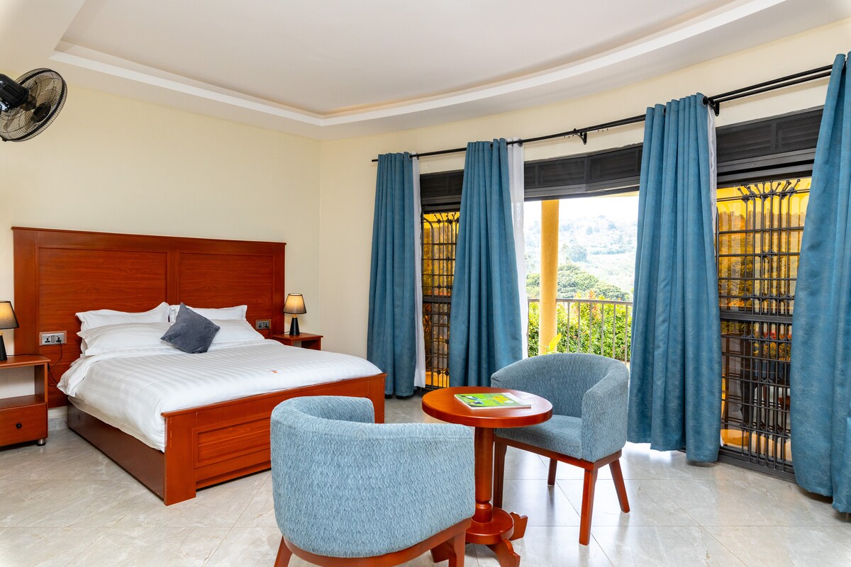 Ubicado en el borde del antiguo lago del cráter volcánico Kyaninga, este lugar ofrece unas vistas impresionantes de la selva tropical circundante y las míticas montañas de la Luna. Los monos colobos negros y blancos y una increíble variedad de aves, incluida una bandada residente de grullas crestas, habitan el entorno inmediato y muchas especies viven en el gran y magnífico jardín tropical que incluye un jardín de meditación/yoga. Te sentirás recomendado y rediseñado aquí; querrás quedarte aquí para siempre.