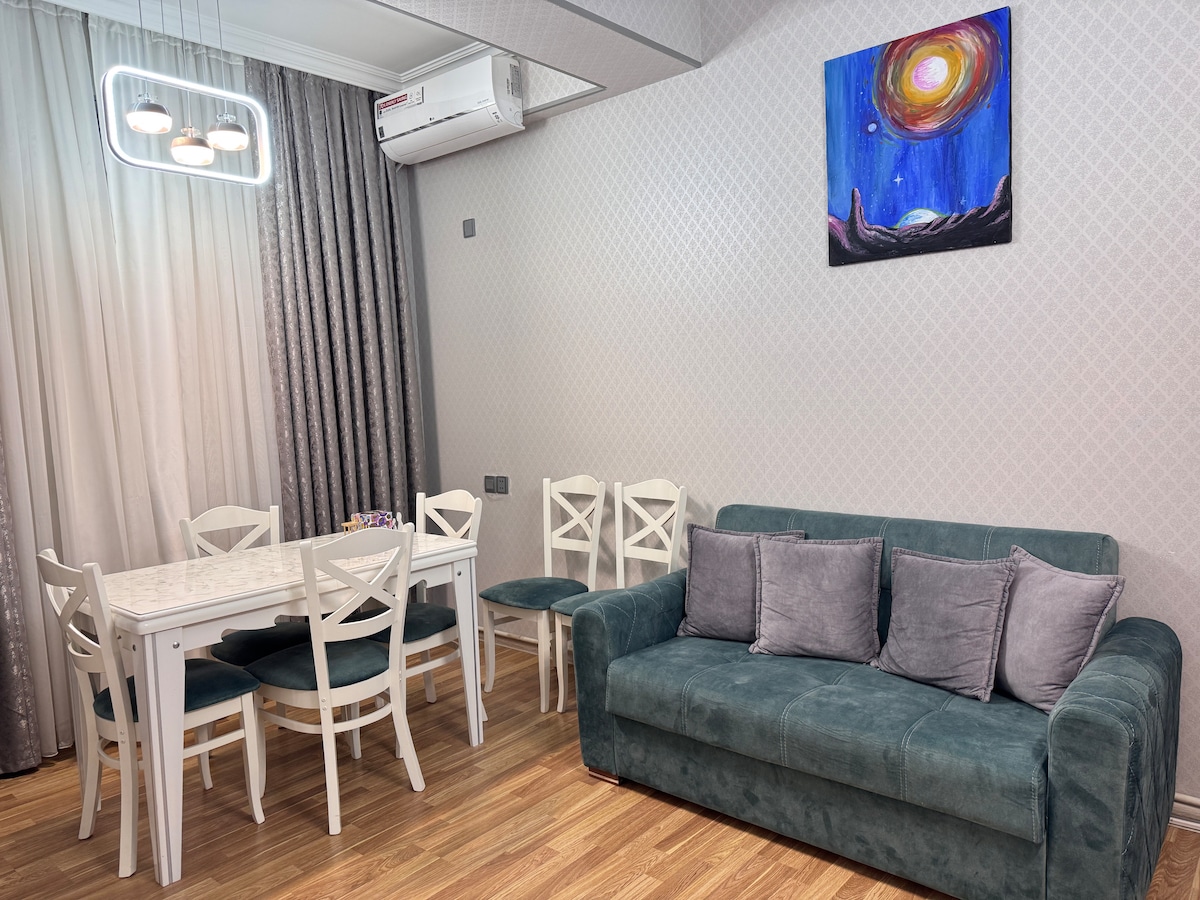 Nuevo apartamento tipo estudio moderno (27 m²) ubicado en el complejo Melisa Residence, a solo 3 minutos a pie de la estación de metro. El centro de la ciudad está a solo 4 paradas de metro. El espacioso y cómodo sofá cama acomoda fácilmente a dos personas. El departamento está totalmente equipado para una estancia acogedora e incluye: estufa de gas y eléctrica mininevera calefacción aire acondicionado secador de cabello plancha lavadora Canales de televisión disponibles en inglés, ruso, turco, alemán, francés, italiano, árabe y otros idiomas.