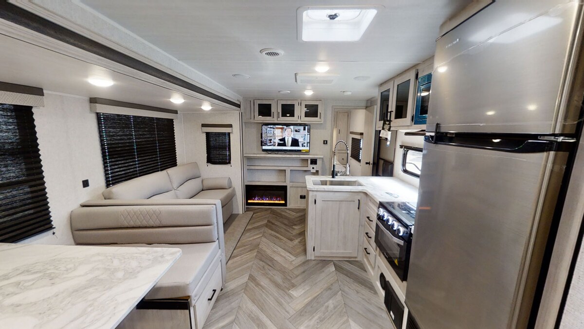 Coachman Catalina Legacy 2020, edición limitada, con una gran extensión deslizable y literas. En la parte delantera de la casa rodante hay una cama tamaño queen, armarios con espejos para colgar la ropa, armarios superiores para guardar cosas y un televisor montado en la pared. La sala de estar tiene una chimenea y armarios de almacenamiento, además de un sofá cama. Comedor tipo cabina con banco. Baño completo con armario con espejo y ducha con tragaluz. Dormitorio trasero con 3 literas, sofá cama tipo cubo, centro de entretenimiento con TV. Radio y reproductor de DVD.