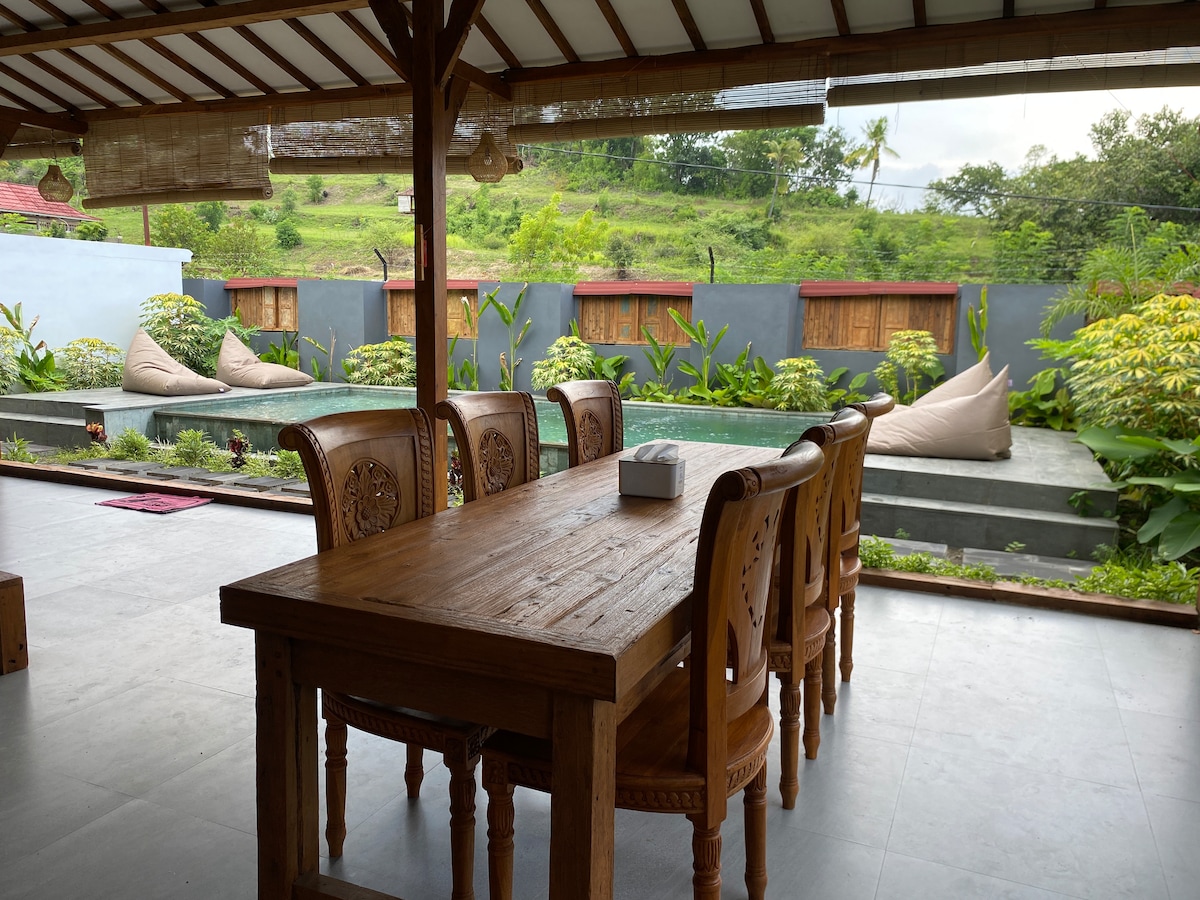 Acogedora casa de huéspedes cerca de la zona de Mataram y Senggigi. Con dormitorio privado, baño, sala de estar y cocina con utensilios básicos de cocina. Bonito jardín con piscina, cenador, mesa de ping pong, juegos de mesa y libros para que tu estancia sea más cómoda con nosotros. Con mucho gusto organizamos el transporte a la ciudad, el traslado al aeropuerto o al puerto y excursiones de un día para explorar el resto de Lombok o las islas Gili.