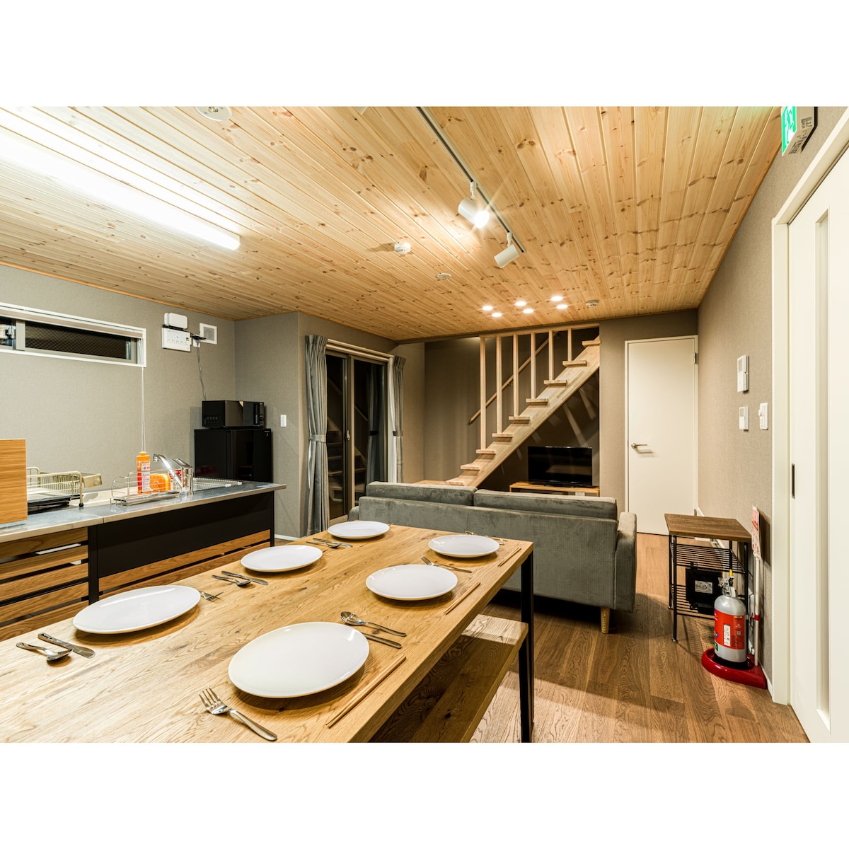 El exterior presenta un contraste de yeso y cedro horneado, y el espacio espacioso y relajante tiene un piso de madera fragante y pura y alfombrillas de tatami.Está totalmente equipado con un kotatsu hundido, un baño de 1 tsubo, un inodoro, una cocina con sistema de lavavajillas y mucho más.Despiértate con el sonido de los pájaros por la mañana y disfruta del cielo estrellado por la noche, un lujo único en el campo. * Esta es una posada hermana de "Folksy House" y "Miu house". También hay★ inglés y chino disponibles, por lo que los huéspedes del extranjero pueden alojarse con tranquilidad. No hay estacionamiento para autos★ grandes (caravanas, camiones, etc.).