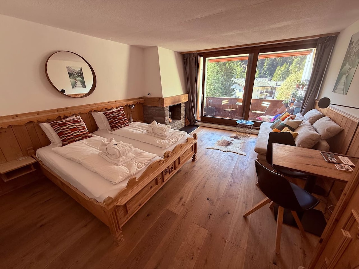 Relájate en este Rifugio único. Apartamento de 2 habitaciones y un aseo totalmente renovado en 2020, cuyo diseño interior ha sido completamente rediseñado. Reformado como loft con los materiales más nobles (granito Valser, parqué de palacio, mucha madera vieja, bañera independiente, chimenea de hierro abierta por dos lados, grifería de diseño). Con terraza y jardín protegidos. Ubicación soleada y tranquila. Entrada privada, sauna en el edificio anexo. Acceso directo a las pistas de esquí o autobús de esquí a tres minutos.