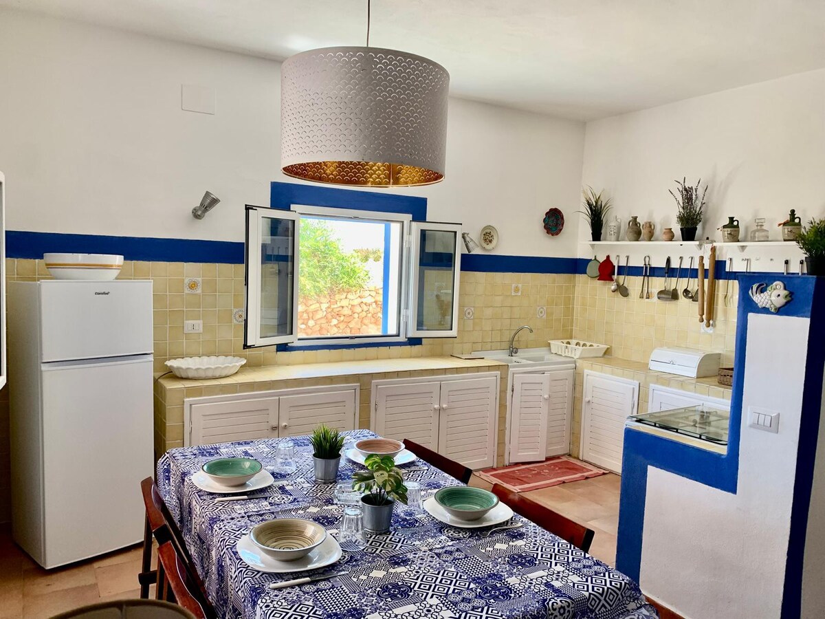 Case a Levante ofrece vistas espectaculares de la bahía de Cala Creta. Desde la casa se puede disfrutar de una vista espectacular del mar azul de Cala Creta y el faro de Grecale. Estacionamiento en la entrada. Tranquilidad absoluta. La ubicación está a unos cientos de metros del aeropuerto y del supermercado. El pueblo está muy cerca. Al salir de la puerta del patio con vistas al mar, a 30 metros de distancia, se encuentra la roca plana equipada de Cala Creta con bar con vistas al mar para disfrutar de excelentes desayunos.