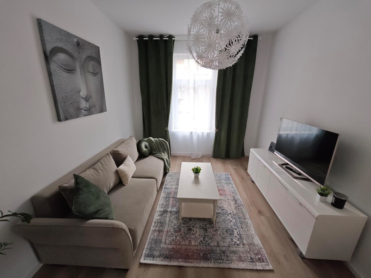 Nuestro acogedor y luminoso apartamento ático es un lugar de relajación cerca del centro de la ciudad (a unos 5 km del centro). El apartamento separado consta de un dormitorio, sala de estar-comedor (dos plazas, TV, zona de estar), así como un pequeño baño privado con inodoro y un hermoso jardín con zona de estar. Los preparativos de los exámenes son posibles sin problemas, ya que es muy tranquilo con nosotros. Los centros de capacitación están cerca: terapia ocupacional, audífonos acústicos a unos 5 minutos.Universidad a 15 minutos. Terreno de exposiciones a unos 7 minutos.