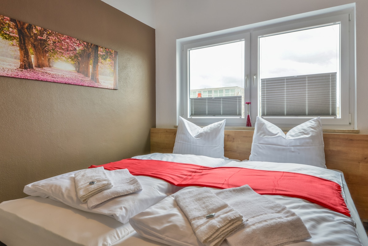 Helle, funktional eingerichtete 4 Zimmer Wohnung mit vier Schlafzimmern und 9 Betten für maximal 10 Personen. 1 Bad, 1 Toilette, Küche mit Esstisch, Spülmaschine, zwei Kühlschränken. Natürlich gibt es Geschirr, Bettwäsche und Handtücher, Shampoo und Duschgel und für längere Aufenthalte auch Putzsachen, Staubsauger und frische Bettwäsche nach Vereinbarung. Schnelles WLAN in allen Räumen. Ein Parkplatz direkt vor´m Haus, weitere öffentliche Parkplätze praktisch immer verfügbar.