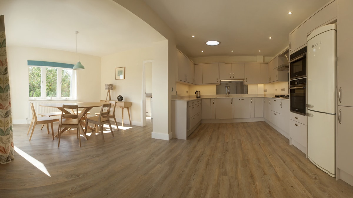 Disfrute de su escapada perfecta en este galardonado ático de 2 dormitorios con vistas al mar de 180 grados en el corazón de la tranquila zona de Alum Chine de Bournemouth, a solo unos minutos a pie de la playa. La propiedad cuenta con dos comedores, uno de los cuales se encuentra en el gran balcón con vistas a la playa de Bournemouth y una estufa de leña a medida para las noches de invierno. La cocina de planta abierta conduce a una acogedora sala de estar donde puedes disfrutar del entretenimiento de Sky Glass TV a través de WiFi súper rápido.